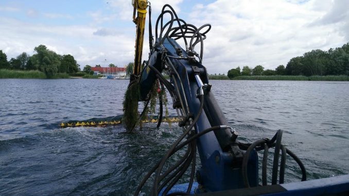 Das Mähboot mit seinem zwei Meter breiten Messer kann die Unterwasserflora bis zu einer Tiefe von 2,20 m abmähen; anschließend wird das Mähgut mit einem breiten Rächen aus dem See gefischt.