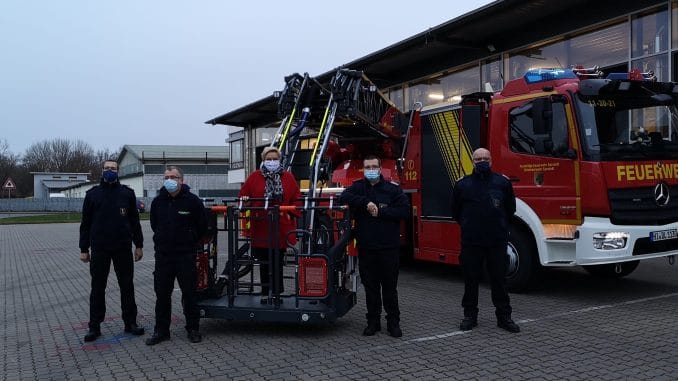 Eine der Neuerungen ist ein Knick in der Leiter, durch welchen auch Dachgiebel und Gauben besser erreichbar seien, erläuterte der stellvertretende Ortsbrandmeister Sebastian Blaut. Außerdem ist der Korb der neuen Drehleiter für ein Gewicht von 500 kg ausgelegt, beinahe das Doppelte gegenüber der alten Drehleiter. „Wir können damit bis zu fünf Personen transportieren“, so Blaut. Neben verbesserten Lagerungsmöglichkeiten verfügt der Korb auch über eine Rollirampe, die beispielsweise bei der Evakuierung von Pflegeheimen von großer Wichtigkeit sein kann. Großen Wert hat man bei der Konfiguration des Fahrzeugs auf die Sicherheit gelegt. Neben umfangreicher Beleuchtung mit vielen Scheinwerfern „fast wie ein fahrender Tannenbaum“, wie Ortsbrandmeister Jens Klug lachend anmerkte, verfügt das Fahrzeug auch über einen Abbiege-Assistenten sowie über eine Atemschutzmaske in der Fahrerkabine neben weiteren im Gerätefach.