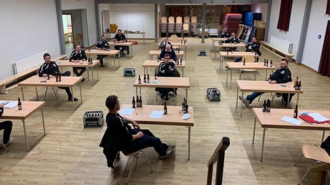 Es war nicht einfach, das Hygiene-Konzept umzusetzen, aber es ist der Junggesellenschaft Hotteln gelungen, ihre Jahresversammlung auch unter Corona-Bedingungen durchzuführen. Aus gruppendynamischen Gründen sicherlich eher fragwürdig – doch damit überhaupt eine Versammlung stattfinden konnte, saßen die jungen Männer jeweils alleine an einem Tisch. Allerdings war diese Zusammenkunft nur vor dem erneuten Lockdown möglich, heute würde ein Treffen von mehr als 10 Personen sicherlich nicht mehr genehmigt.