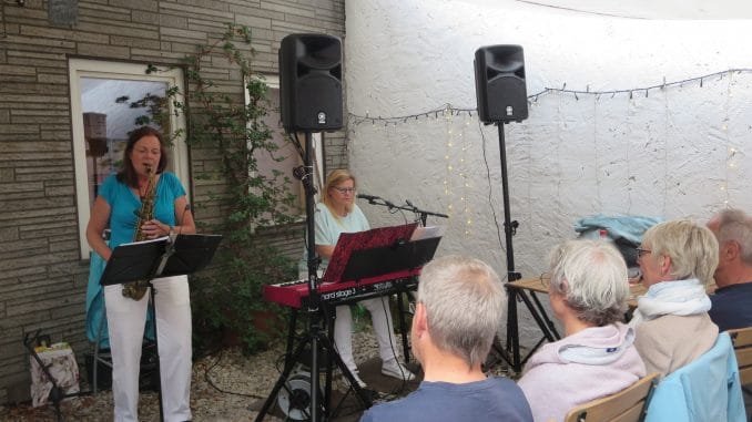 „15 Monate kein Weinausschank, länger noch keine Musik mehr hier in unserem Innenhof!“ Karl-Heinz Forster quoll am Donnerstag, dem 22. Juli die Freude aus jeder Lachfalte, als er nach langer Abstinenz seine Gäste im Innenhof hinter dem Weinlädchen an der Steinstraße begrüßte. Die waren nicht nur gekommen, um mal wieder einen guten Tropfen in netter Gesellschaft zu genießen, sondern auch, um das Duo „Sometimes“ zu hören. Dahinter verbergen sich Marion Heuer am (E-)Piano und Christiane Vajen am Altsaxophon. Und „Sometimes“ haben sie sich genannt, „weil wir nur manchmal zusammen spielen“, wie Heuer, die an diesem Abend den launigen Plauder-Part übernahm, erklärte.
