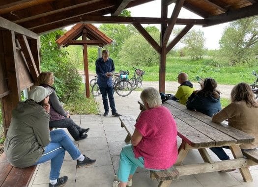 Die von der Stadtbücherei Sarstedt geplanten LiteraTouren gingen am 25.05.22 in die erste Runde. Die Fahrradtour begann mit einer Lesung im Lesegarten der Bücherei, vorgetragen wurde aus dem Buch von Christiane Hoffmann, „Alles, was wir nicht erinnern – Zu Fuß auf dem Fluchtweg meines Vaters“, das für den Preis der Leipziger Buchmesse 2022 nominiert wurde.