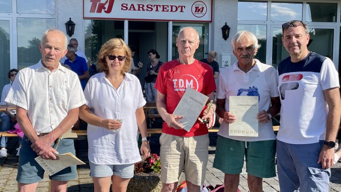 Sarstedt (jm). Zur 50-jährigen Jubiläumsfeier des TKJ-Lauftreffs konnte Lauftreff-Leiter Björn Bartels am vorigen Sonnabend, dem 02. Juli, zahlreiche Aktive sowie ehemalige Ausdauersportler begrüßen. Die weiteste Anfahrt hatte sicherlich Thorsten Lindemann, der aus diesem Anlass extra von der Schlei in Schleswig-Holstein nach Sarstedt gekommen war. Außerdem dabei waren Alexander Maus, Vorsitzender der TKJ-Leichtathletik-Abteilung, zu der der Lauftreff als Sparte gehört, sowie der TKJ-Hauptvereins-Vorstand Eric Kiepke und Grit Janke-Lenz, beide selbst im Lauftreff aktiv.