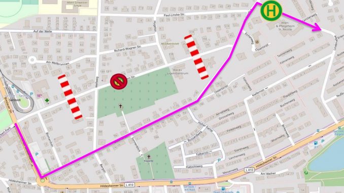 Die Friedrich-Ebert-Straße in Sarstedt ist aufgrund von Kanal- und Straßenbauarbeiten noch bis Ende 2023 von der Kreuzung Wellweg bis zur Kreuzung Kipphut voll gesperrt. Die Umleitung der Linie 201 zur Haltestelle Lindenallee erfolgt über die Ostertorstraße. Die Haltestelle am Friedhof kann nicht mehr angefahren werden.