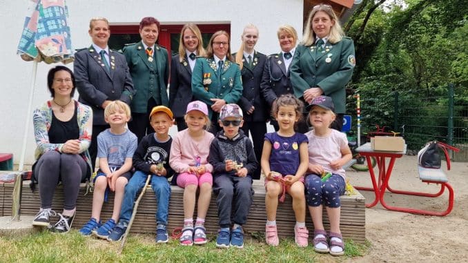 Der Wiedererkennungswert lässt sich nicht leugnen und so breitet sich am frühen Donnerstagvormittag schnell eine neugierige Aufregung zwischen den Kindergartenkindern aus. Die Mädchen und Jungen der Kindertagesstätte „Spielzimmer“ und der Elterninitiative „Wirbelwind“ wissen natürlich sofort Bescheid, was in den kommenden vier Tagen bevorsteht. Einige berichten aufgeregt, dass sie bereits die Aufbauarbeiten auf dem Schützenplatz am Bruchgraben verfolgt und die ersten Fahrgeschäfte und Buden begutachtet haben. Die besonders Aufmerksamen unter ihnen erkennen schnell, dass auch die Schützinnen nicht mit leeren Händen gekommen sind. Im Gegensatz zu den Vorjahren haben diese allerdings nicht die bis dato traditionellen Lebkuchenherzen mit dabei. Die empfände man mittlerweile als nicht mehr zeitgemäß und so bekommen die Kinder stattdessen Tüten mit bunten Gummibärchen sowie ein kleines Spielzeug ihrer Wahl – einen gefährlichen Dino oder eine glitzernde Puppe – überreicht. Auch die Krippenkinder sollen nicht leer ausgehen und so sorgt Mareile Marske mit einem Schwung „Quetschies“ dafür, dass der Nachtisch an diesem Tag gesichert ist. Wer die Frau in der prachtvollen Uniform ist, verstehen die Kleinsten zwar noch nicht so richtig, dass sich in den bunten Päckchen aber ein lecker-fruchtiger Schmaus befindet, haben sie schnell durchschaut.