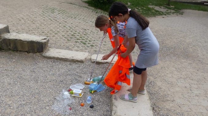 Während die „Fühlkisten“ ein bisschen Mut brauchten, ohne hinzusehen in Kisten zu greifen und zu erfühlen, welche Naturmaterialien sich darin befinden, um dadurch unter anderem zu lernen, die Umwelt mit allen Sinnen, also in diesem Fall dem Tastsinn, zu erkunden, waren die Stationen Mülltrennung „Spogomi“ und „Wassertransport“ definitiv wettbewerbsorientiert. Auf Zeit sammelten die Schülerinnen und Schüler mit einem Greifer Müll auf und trennten diesen anschließend nach Restmüll, Papier, Bioabfall und Plastikmüll. Das war für manche der Mädchen und Jungen eine echte Herausforderung. Was ist Plastikmüll? Warum kommt der in eine andere Tonne als der Restmüll? Beim Wassertransport ging es darum, mit einem Schwamm Wasser aufzunehmen und diesen vollgesaugten Schwamm zu einem Messbecher zu transportieren, ohne viel Wasser zu verlieren. Hier sollten die Kinder auf spielerische Art und Weise den Umgang mit Wasser im Sinne von „Wassersparen“ lernen.
