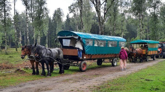 Nach etwa zwei Stunden Fahrt, die über Celle und Hermannsburg führte, kam die Gruppe in Neulutterloh auf dem Hof von Krügers Heidekutschfahrten an. Auf drei Kutschen verteilt ging es bei Regen los. Da diese jedoch überdacht waren, tat das Wetter der guten Laune keinen Abbruch. Kutscher Gerd und die zwei Pferde Elli und Rösschen haben treu ihren Dienst getan und ihre Passagiere durch die Heide gefahren. Mit an der Kutschdecke hängenden Würsten und Brot sowie Handwerkszeug in Form von Schneidebrettchen und Messern konnte sich an Bord vorzüglich verpflegt werden. Auch Getränke standen für jeden bereit und so konnten in aller Ruhe und Gemütlichkeit die Mägen gefüllt und die Landschaft bestaunt werden – vorbei an blühenden Heidefeldern und dem Rotkäppchenhaus, das inzwischen sogar einen Strom- und Telefonanschluss besitzt.