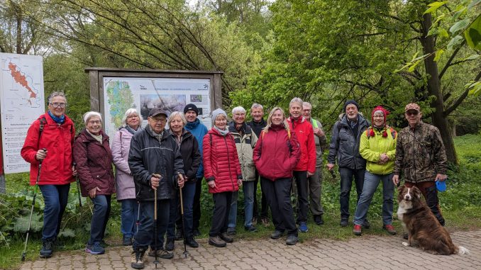 Auf Höhe der alten Radrennbahn gab der Wanderbegleiter der Gruppe seine ersten Hinweise. Unter anderem machte Beckmann auf zwei besetzte Storchennester aufmerksam und empfahl den naheliegenden Biergarten, welcher bei wärmeren Temperaturen ein lohnendes Wanderziel gewesen wäre. Nach dem Überschreiten der neuen Leinebrücke wurde an der „Späte Holzwiesen“ eine kleine Rast eingelegt, über die sich vor allem Karl-Heinz Max, der älteste Mitwanderer in der Runde, freute. Max feiert in diesem Jahr sein 50-jähriges Jubiläum in der Wanderabteilung.