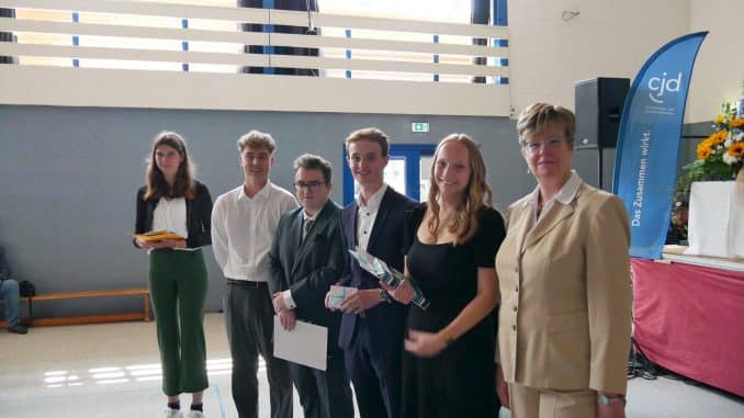 Pünktlich um 10 Uhr zogen die Abiturientinnen und Abiturienten zu den Klängen des Songs „Can’t Tell Me Nothing“ von Kanye West in die Aula ein. Nachdem sie in den vorderen Reihen Platz genommen hatten, erklang das CJD-Lied „Und das Leben lacht“. Schulleiterin Monika Gerdemann eröffnete die offizielle Zeremonie mit einer herzlichen Begrüßung und gratulierte den Abiturientinnen und Abiturienten. Dann griff sie das Motto der Absolvierenden – „Autogramme gibt es später“ – auf und stellte in den Raum: „Autogramme wofür? Vielleicht für erreichtes Ansehen?“ Sie stellte heraus, dass die Zufriedenheit mit dem Erreichten wesentlich ist und wünschte allen, dass Freundschaft und Gemeinschaft weiterhin ihr Leben prägen mögen. Sie knüpfte an die Andacht an und betonte, dass das Neue und anstehende Lebensentscheidungen Angst machen und Mut erfordern. Die Schulzeit habe jedoch eine gute Basis geschaffen, um den Herausforderungen zu begegnen. „Der Ernst des Lebens wartet, doch lasst euch davon nicht abschrecken, denn Ernst ist ein entspannter Typ, wenn man ihm mit einem Lächeln begegnet“, sagte sie abschließend mit einem Schmunzeln. Der Vorsitzende des Schulelternrats Michél Liebethal sprach ebenfalls Glückwünsche aus und gab den Rat, mit kleinen Dingen anzufangen. Er zitierte aus der Abschlussrede des ehemaligen Admirals William McRaven: „Mache jeden Morgen dein Bett. Somit hast du die erste Aufgabe an diesem Tag geschafft.“ Zum Schluss ermutigte er die Absolventinnen und Absolventen: „Genießt den Tag – es ist Euer Tag!“ Helene Bock, ehemalige Schülerin, versicherte den Abiturientinnen und Abiturienten, dass das Leben interessant und spannend wird, warnte jedoch, dass es durchaus anstrengend sei, für das eigene Leben verantwortlich zu sein. Nele Neubauer, Abiturientin 2023, fügte hinzu: „Ihr werdet auf eurem Weg nicht allein sein! Neue Freundschaften entstehen. Die Erinnerungen an die Erlebnisse in der Schule aber bleiben.“