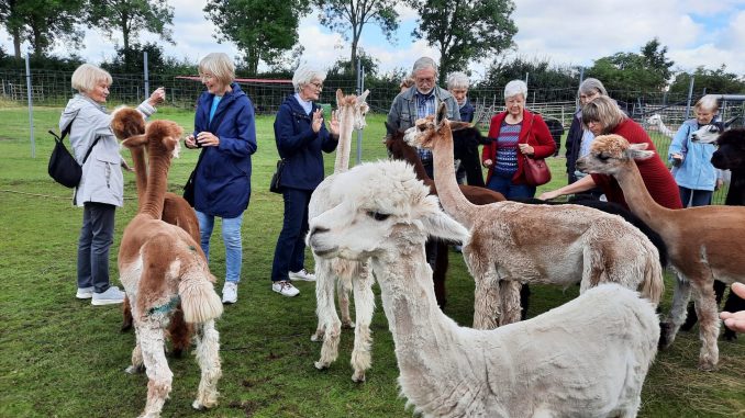 Um 10.30 Uhr wurde die Reisegruppe auf dem Alpaka Hof bei Sonnenschein herzlich begrüßt. Der Alpaka-Hof „Pura Vida“ lädt dazu ein, „sich hier einfach tierisch wohlzufühlen“. Bei einem peruanischen Getränk wurden die Teilnehmenden von dem Ehepaar Meier über die gutmütigen Alpakas unterrichtet. Mit Blick auf die Weide, auf der die Alpakas weilten, wurde sich mit Gitarre und Gesang eingestimmt, anschließend konnten die Alpakas mit kleinen Getreidekörnern aus der Hand gefüttert werden. Im Hofrestaurant, einer rustikalen Diele eines Niedersachsenhofs, wurde im Anschluss eine Süßkartoffelsuppe nach peruanischem Rezept herangereicht und im Hoflädchen konnten die hochwertigen Produkte aus der Wolle der Alpakas bewundert und erworben werden.