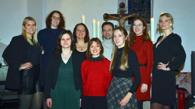 So sind auch das Auftreten und das Programm der sieben Sängerinnen zu beschreiben. Die jungen Frauen harmonierten nicht nur gesanglich zusammen, auch die gute Stimmung im Ensemble war wieder einmal deutlich zu erkennen. Das abwechslungsreiche Programm untermalte dieses perfekt und ließ noch einmal auf die vergangene Weihnachtszeit zurückblicken. Klassiker wie “White Christmas”, “The Little Drummer Boy” und „Mitten in der Nacht” bezauberten durch ruhige, ausgewogene Klänge, und Weihnachtshits wie “All I Want For Christmas”, “Sleigh Ride” und die deutsche Version von “Mary’s Boychild” sorgten für viel Stimmung in der Kirche. Das Ensemble umrahmte das Programm mit „100.000 Friedenslichter” sowie „Und brennen 100.000 Kerzen”. Beide Lieder sind aus der Adventsfestshow von Florian Silbereisen bekannt und erinnern an die zentralen Werte von Weihnachten: Frieden, Geborgenheit, Hoffnung und Liebe. Anja Hinske-Schwedthelm (Leitung) am Klavier und Christian Aschenbrenner am Schlagzeug unterstützten mit ihren Begleitungen den Gesang auf eine ganz besondere Weise, mit viel Hingabe und musikalischen Akzenten.
