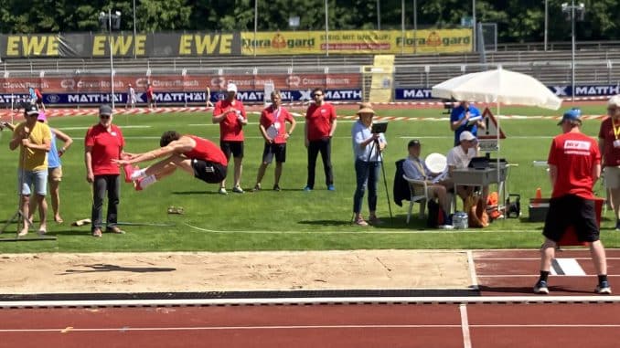 Bestweiten lieferte dagegen Luca Willig. Der 17-jährige Mehrkämpfer des TKJ Sarstedt war für die Disziplinen Weit- und Dreisprung angereist. In der eigens für diesen Wettkampf wieder aktivierten Sprunggrube parallel zur großen Zuschauertribüne setzte sich Luca Willig bereits mit seinem ersten knapp unter 6 Meter weiten Sprung an die Spitze des Teilnehmerfeldes. Dann folgte, unterstützt von günstigen Windverhältnissen, eine neue Bestweite von 6,29 Metern. Mit diesem Sprung kürte sich Luca Willig zum neuen Niedersachsenmeister im Weitsprung und durfte sich über den begehrten Wimpel des Niedersächsischen Leichtathletikverbandes sowie eine Oldenburg-Tasse als Präsent freuen.